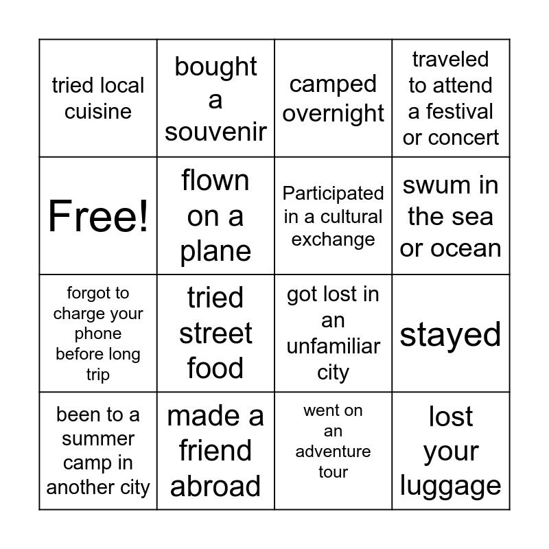 This bingo card has 16 words: made a friend abroad, stayed, camped overnight, tried local cuisine, forgot to charge your phone before long trip, bought a souvenir, got lost in an unfamiliar city, went on an adventure tour, Free!, flown on a plane, been to a summer camp in another city, traveled to attend a festival or concert, tried street food, swum in the sea or ocean, Participated in a cultural exchange and lost your luggage.