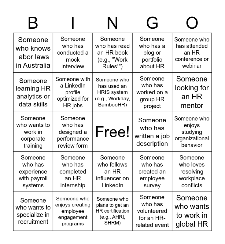 This bingo card has a free space and 24 words: Someone who has completed an HR internship, Someone who enjoys creating employee engagement programs, Someone who has used an HRIS system (e.g., Workday, BambooHR), Someone who wants to specialize in recruitment, Someone who has attended an HR conference or webinar, Someone who knows labor laws in Australia, Someone learning HR analytics or data skills, Someone who has conducted a mock interview, Someone who has written a job description, Someone who follows an HR influencer on LinkedIn, Someone who has worked on a group HR project, Someone who wants to work in corporate training, Someone who has created an employee survey, Someone who loves resolving workplace conflicts, Someone with a LinkedIn profile optimized for HR jobs, Someone who has volunteered for an HR-related event, Someone who enjoys studying organizational behavior, Someone who has read an HR book (e.g., "Work Rules!"), Someone looking for an HR mentor, Someone who has designed a performance review form, Someone who wants to work in global HR, Someone who has experience with payroll systems, Someone who has a blog or portfolio about HR and Someone who plans to get an HR certification (e.g., AHRI, SHRM).