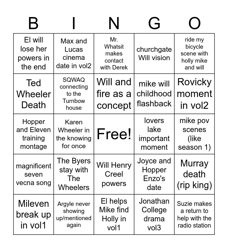 This bingo card has a free space and 24 words: The Byers stay with The Wheelers, Argyle never showing up/mentioned again, Will and fire as a concept, Mileven break up in vol1, ride my bicycle scene with holly mike and will, El will lose her powers in the end, Ted Wheeler Death, Max and Lucas cinema date in vol2, lovers lake important moment, Will Henry Creel powers, mike will childhood flashback, Hopper and Eleven training montage, Joyce and Hopper Enzo's date, Murray death (rip king), SQWAQ connecting to the Turnbow house, Jonathan College drama vol3, mike pov scenes (like season 1), Mr. Whatsit makes contact with Derek, Rovicky moment in vol2, Karen Wheeler in the knowing for once, Suzie makes a return to help with the radio station, magnificent seven vecna song, churchgate Will vision and El helps Mike find Holly in vol1.