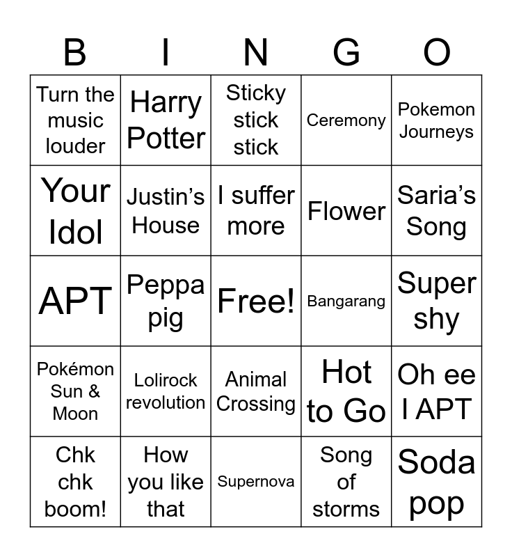 This bingo card has a free space and 29 words: Chk chk boom!, Golden, Peppa pig, Paw Patrol, Turn the music louder, Sticky stick stick, Justin’s House, Lolirock revolution, Bangarang, How you like that, Super shy, Soda pop, Supernova, Song of storms, Saria’s Song, KK Metal, Animal Crossing, Pokémon Sun & Moon, Pokemon Journeys, APT, Hot to Go, My Little Pony, Flower, Your Idol, Ceremony, Harry Potter, Oh ee I APT, I suffer more and Snape Ticking.