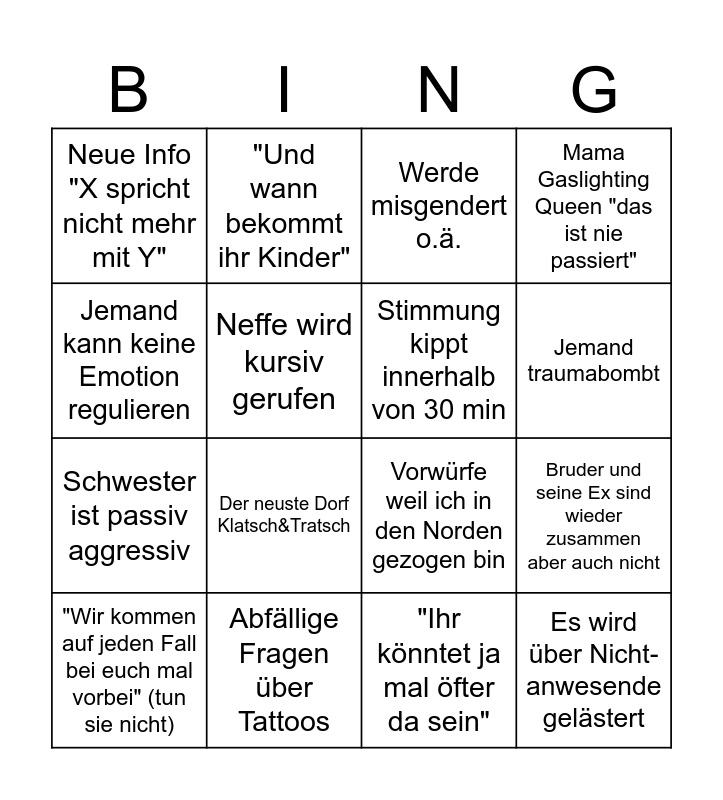 This bingo card has 16 words: Abfällige Fragen über Tattoos, Bruder und seine Ex sind wieder zusammen aber auch nicht, Werde misgendert o.ä., Neue Info "X spricht nicht mehr mit Y", Schwester ist passiv aggressiv, "Und wann bekommt ihr Kinder", Vorwürfe weil ich in den Norden gezogen bin, "Ihr könntet ja mal öfter da sein", Jemand kann keine Emotion regulieren, Neffe wird kursiv gerufen, "Wir kommen auf jeden Fall bei euch mal vorbei" (tun sie nicht), Mama Gaslighting Queen "das ist nie passiert", Der neuste Dorf Klatsch&Tratsch, Jemand traumabombt, Stimmung kippt innerhalb von 30 min and Es wird über Nicht- anwesende gelästert.