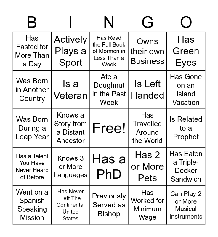 This bingo card has a free space and 29 words: Went on a Spanish Speaking Mission, Went on a Mission in Asia, Knows a Story from a Distant Ancestor, Met a Member of the Quorum of the 12 Apostles, Has Fasted for More Than a Day, Has Read the Full Book of Mormon in Less Than a Week, Is a Veteran, Knows 3 or More Languages, Has Travelled Around the World, Has Never Left The Continental United States, Is Related to a Prophet, Can Play 2 or More Musical Instruments, Previously Served as Bishop, Has Worked for Minimum Wage, Has Gone on an Island Vacation, Has Been Fired From a Job, Has a PhD, Has a Talent You Have Never Heard of Before, Has Green Eyes, Was Born During a Leap Year, Has 2 or More Pets, Has lived in Ohio for 20 or More Years, Is Left Handed, Was Born in Another Country, Owns their own Business, Actively Plays a Sport, Has Eaten a Triple-Decker Sandwich, Ate a Doughnut in the Past Week and Cannot Ride a Bike.
