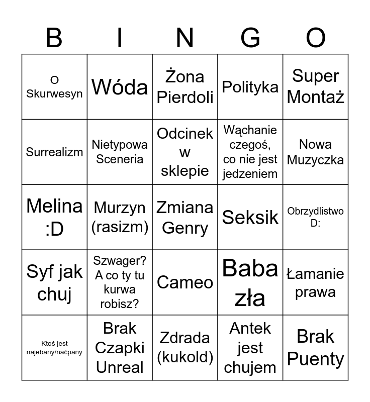 This bingo card has a free space and 24 words: Szwager? A co ty tu kurwa robisz?, Brak Czapki Unreal, Odcinek w sklepie, Ktoś jest najebany/naćpany, Super Montaż, O Skurwesyn, Surrealizm, Wóda, Seksik, Cameo, Wąchanie czegoś, co nie jest jedzeniem, Melina :D, Baba zła, Łamanie prawa, Nietypowa Sceneria, Antek jest chujem, Obrzydlistwo D:, Żona Pierdoli, Nowa Muzyczka, Murzyn (rasizm), Brak Puenty, Syf jak chuj, Polityka and Zdrada (kukold).