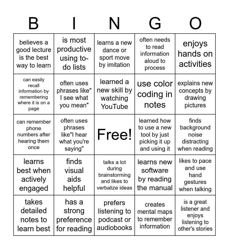 This bingo card has a free space and 25 words: finds visual aids helpful, prefers listening to podcast or audiobooks, learned a new skill by watching YouTube, takes detailed notes to learn best, enjoys hands on activities, believes a good lecture is the best way to learn, can easily recall information by remembering where it is on a page, is most productive using to-do lists, learned how to use a new tool by just picking it up and using it, talks a lot during brainstorming and likes to verbalize ideas, use color coding in notes, can remember phone numbers after hearing them once, learns new software by reading the manual, likes to pace and use hand gestures when talking, often uses phrases like" I see what you mean", learns best through trial and error, finds background noise distracting when reading, learns a new dance or sport move by imitation, explains new concepts by drawing pictures, often uses phrases like"I hear what you're saying", is a great listener and enjoys listening to other's stories, has a strong preference for reading, learns best when actively engaged, often needs to read information aloud to process and creates mental maps to remember information.