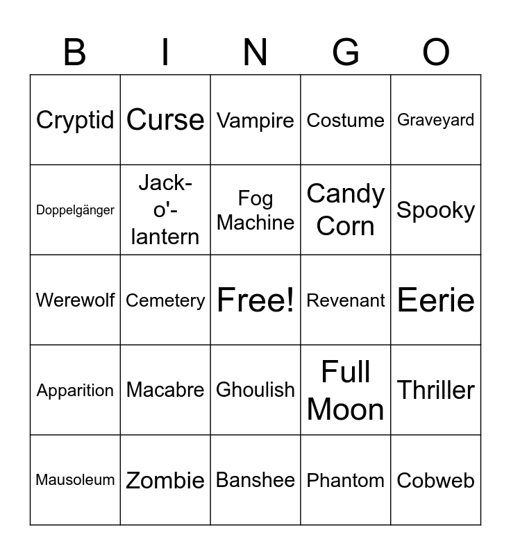 This bingo card has a free space and 30 words: Zombie, Haunted, Cemetery, Cauldron, Cryptid, Vampire, Jack-o'-lantern, Ghoulish, Revenant, Banshee, Eerie, Cobweb, Phantom, Incantation, Spooky, Poltergeist, Full Moon, Apparition, Macabre, Graveyard, Werewolf, Seance, Curse, Candy Corn, Doppelgänger, Costume, Thriller, Mausoleum, Fog Machine and Superstition.