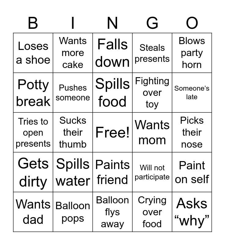 This bingo card has a free space and 28 words: Paint on self, Singing Happy Birthday, Fighting over toy, Crying over food, Potty break, Falls down, Wants more cake, Gets dirty, Wants mom, Wants dad, Tries to open presents, Steals presents, Balloon pops, Balloon flys away, Someone’s late, Can’t find mom, Spills water, Pushes someone, Spills food, Paints friend, Loses a shoe, Has accident, Asks “why”, Sucks their thumb, Picks their nose, Will not participate, Blows party horn and Loses car.