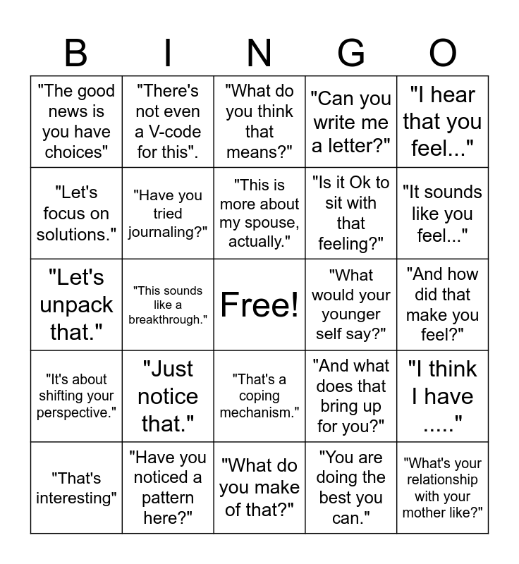 This bingo card has a free space and 29 words: "That's interesting", I want you to think about that this week.", "This sounds like a breakthrough.", "Let's circle back to that later.", "The good news is you have choices", "What do you think that means?", "Have you tried journaling?", "Just notice that.", "What would your younger self say?", "Have you noticed a pattern here?", "And how did that make you feel?", "What's your relationship with your mother like?", "What do you make of that?", "You are doing the best you can.", "It sounds like you feel...", "Tell me more about that.", "That's a coping mechanism.", "It's about shifting your perspective.", "I hear that you feel...", "Let's unpack that.", "And what does that bring up for you?", "Is that serving you?", "Is it Ok to sit with that feeling?", "Let's focus on solutions.", "Can you write me a letter?", "There's not even a V-code for this"., "I think I have .....", "This is more about my spouse, actually." and "Fix my kid!".