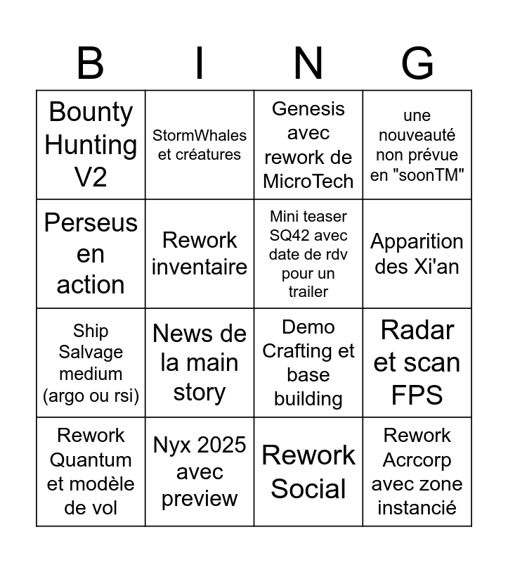 This bingo card has 16 words: Nyx 2025 avec preview, Radar et scan FPS, Genesis avec rework de MicroTech, Bounty Hunting V2, Ship Salvage medium (argo ou rsi), StormWhales et créatures, Demo Crafting et base building, Rework Social, Perseus en action, Rework inventaire, Rework Quantum et modèle de vol, une nouveauté non prévue en "soonTM", News de la main story, Apparition des Xi'an, Mini teaser SQ42 avec date de rdv pour un trailer and Rework Acrcorp avec zone instancié.
