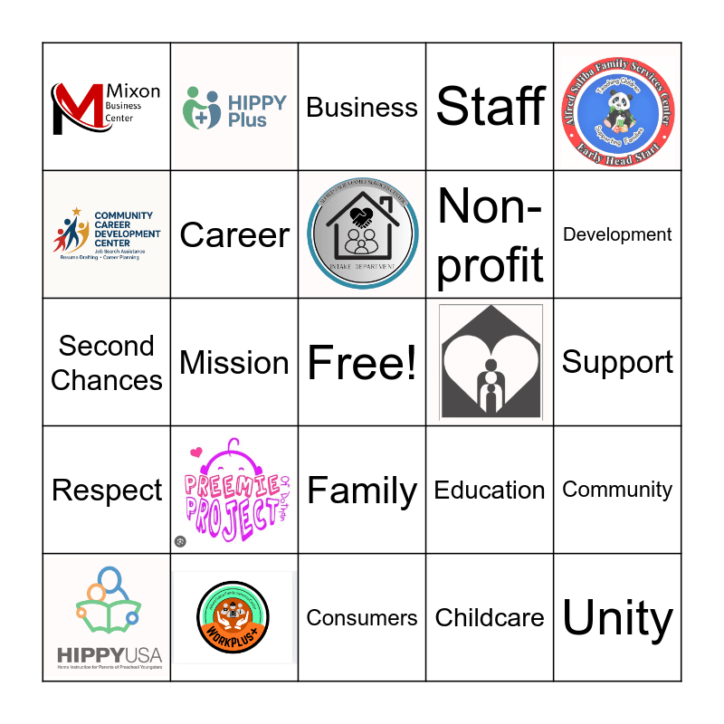 This bingo card has 9 images, a free space and 15 words: Family, Non-profit, Second Chances, Education, Community, Career, Childcare, Support, Business, Development, Mission, Unity, Respect, Staff and Consumers.
