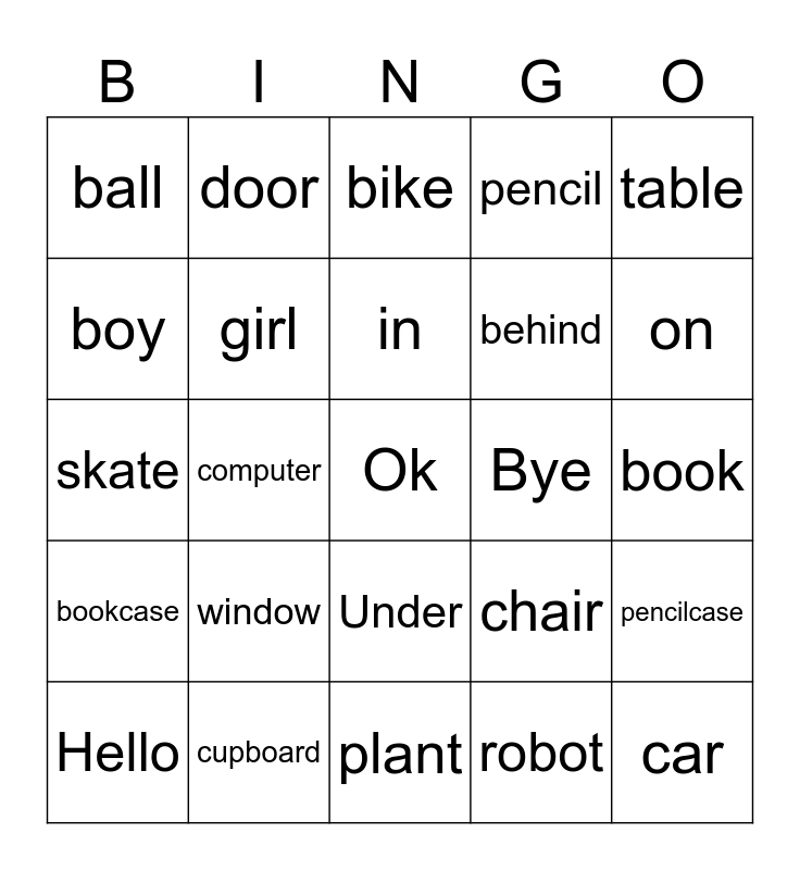This bingo card has a free space and 24 words: window, cupboard, in, Hello, table, ball, boy, door, Bye, Under, behind, skate, chair, pencilcase, girl, robot, book, bike, on, computer, car, bookcase, pencil and plant.