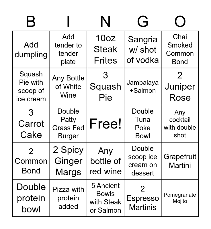 This bingo card has a free space and 24 words: 2 Spicy Ginger Margs, Pizza with protein added, 3 Squash Pie, Double protein bowl, Chai Smoked Common Bond, Add dumpling, Squash Pie with scoop of ice cream, Add tender to tender plate, Double Tuna Poke Bowl, Any bottle of red wine, Jambalaya +Salmon, 3 Carrot Cake, Double scoop ice cream on dessert, Grapefruit Martini, Any Bottle of White Wine, 2 Espresso Martinis, Any cocktail with double shot, 10oz Steak Frites, 2 Juniper Rose, Double Patty Grass Fed Burger, Pomegranate Mojito, 2 Common Bond, Sangria w/ shot of vodka and 5 Ancient Bowls with Steak or Salmon.
