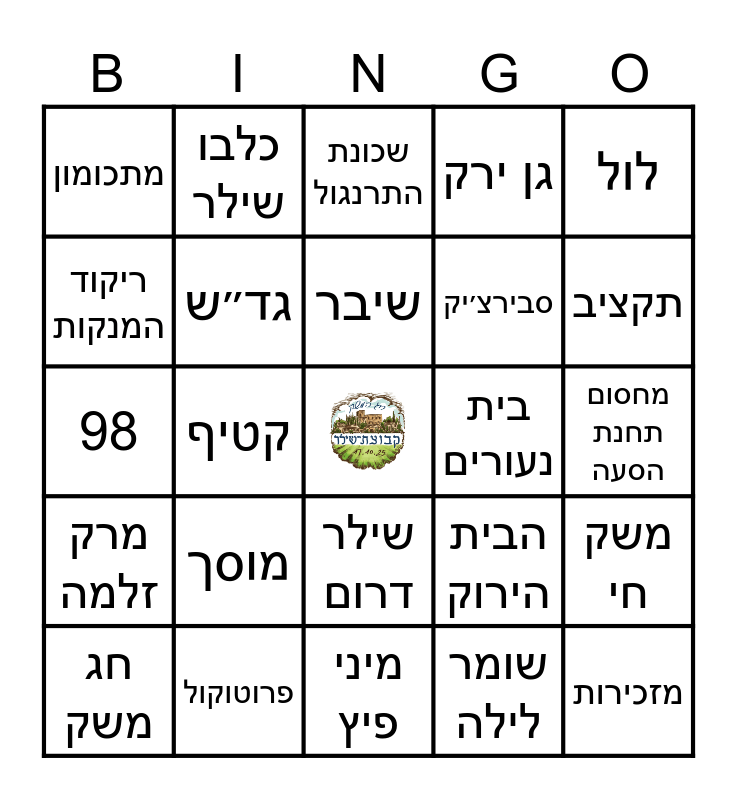 This bingo card has a free space and 50 words: חדר אוכל, מזכירות, הנגרייה, מיני פיץ, מוסך, אבוקדו, כלבו שילר, אולם מופעים, ריקוד המנקות, ריקוד המחזורים, גד״ש, גן ירק, משק חי, הבית הירוק, רפת, דיסקו דנה, שיבר, בית נעורים, מרחב, לול, קטיף, שומר לילה, מתכומון, סבירצ׳יק, פרימוס, מנהרה, תקציב, בית הדר, שכונת התרנגול, שילר דרום, הגבעה, שנת חופש, גיוסים, גינה קהילתית, פרוטוקול, דשא חתונות, השיקמה, שילטקס, שער 2, מחסום תחנת הסעה, בית ביטחון, קלנועית, באר א, אסיפה, חג משק, 98, טרקטור צהוב, עלעלים, מרק זלמה and תשתיות.