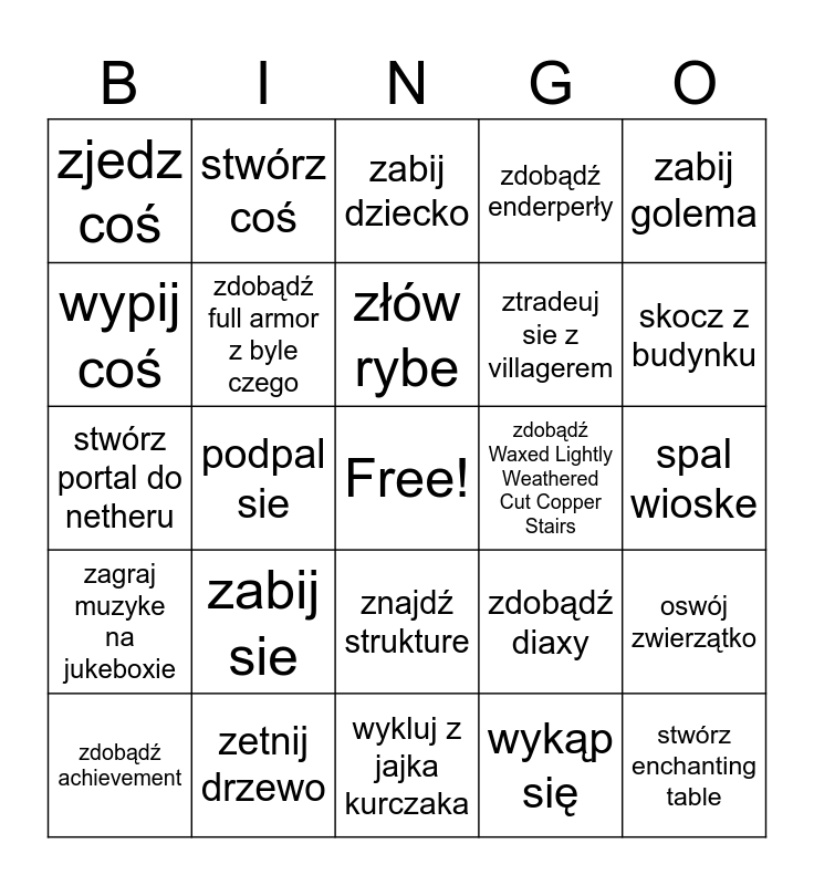 This bingo card has a free space and 24 words: zabij sie, zetnij drzewo, złów rybe, zdobądź achievement, zabij golema, zjedz coś, wypij coś, stwórz coś, zdobądź Waxed Lightly Weathered Cut Copper Stairs, znajdź strukture, ztradeuj sie z villagerem, stwórz portal do netheru, zdobądź diaxy, oswój zwierzątko, zdobądź full armor z byle czego, wykąp się, spal wioske, zabij dziecko, skocz z budynku, podpal sie, stwórz enchanting table, zagraj muzyke na jukeboxie, zdobądź enderperły and wykluj z jajka kurczaka.