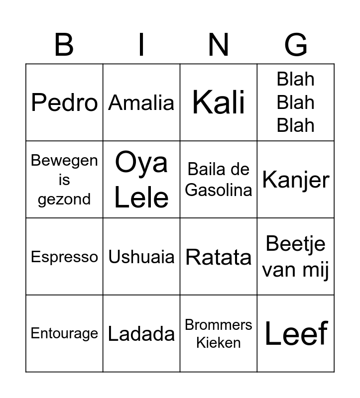 This bingo card has 39 words: Zoet Zout Zuur, Lotje, Dora, Baila de Gasolina, Blikkendag, Weekend, Kanjer, Soco Bate Vira, Bewegen is gezond, Leef, Beetje van mij, Blah Blah Blah, Entourage, Brommers Kieken, Ladada, Dance the Night, Noodgeval, Pedro, Feesttent, Macarena, Oya Lele, Sugardaddy, Espresso, Ushuaia, APT, Ik ben kachel, Rasputin, Links rechts, Automatisch, Amalia, 1 team 1 taak, ik ga zwemmen, Kali, Vanovond (uit m'n bol), Spijt is voor later, Viva Hollandia, Europapa, Ratata and Terug in de tijd.