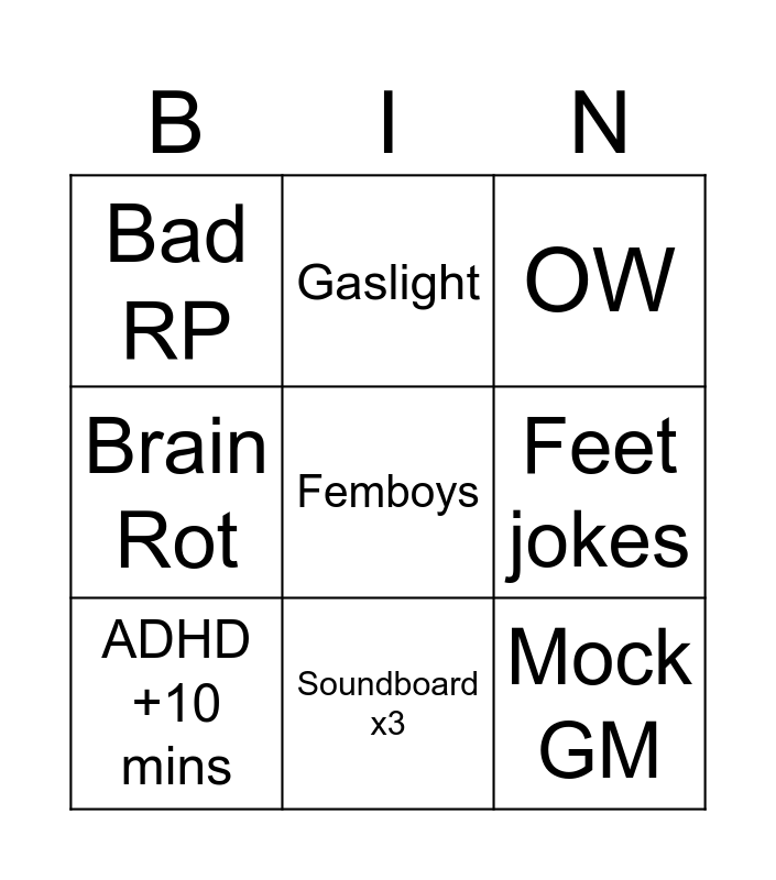This bingo card has 9 words: ADHD +10 mins, OW, Gaslight, Brain Rot, Bad RP, Feet jokes, Femboys, Mock GM and Soundboard x3.