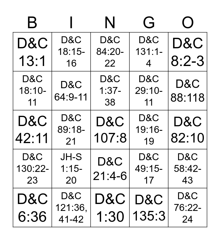 This bingo card has 25 words: JH-S 1:15-20, D&C 1:30, D&C 1:37-38, D&C 6:36, D&C 8:2-3, D&C 13:1, D&C 18:10-11, D&C 18:15-16, D&C 19:16-19, D&C 21:4-6, D&C 29:10-11, D&C 42:11, D&C 49:15-17, D&C 58:42-43, D&C 64:9-11, D&C 76:22-24, D&C 82:10, D&C 84:20-22, D&C 88:118, D&C 89:18-21, D&C 107:8, D&C 121:36, 41-42, D&C 130:22-23, D&C 131:1-4 and D&C 135:3.