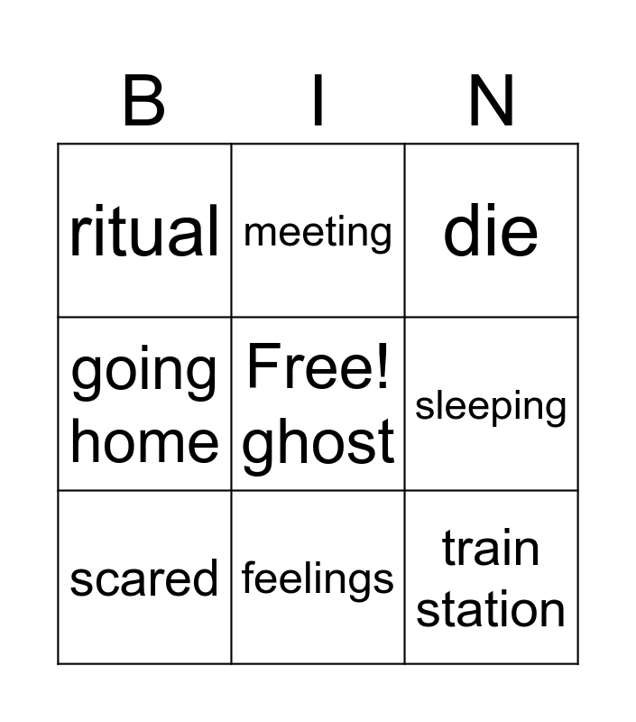 This bingo card has a free space and 8 words: sleeping, die, meeting, scared, ritual, train station, going home and feelings.