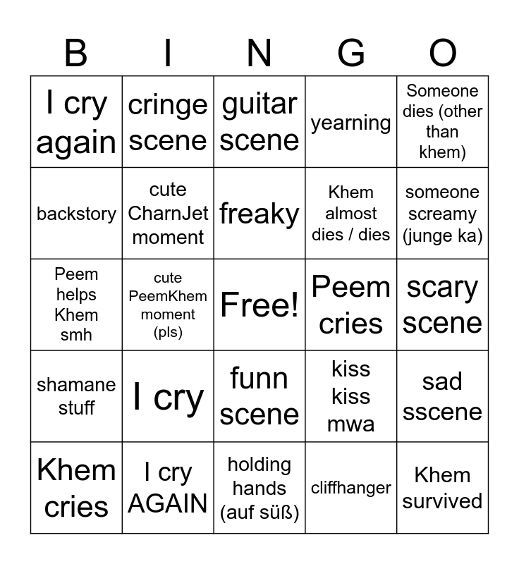 This bingo card has a free space and 24 words: I cry, I cry AGAIN, freaky, Khem cries, Someone dies (other than khem), I cry again, backstory, cringe scene, Peem cries, funn scene, Khem almost dies / dies, Peem helps Khem smh, kiss kiss mwa, sad sscene, cute CharnJet moment, cliffhanger, scary scene, guitar scene, someone screamy (junge ka), cute PeemKhem moment (pls), Khem survived, shamane stuff, yearning and holding hands (auf süß).