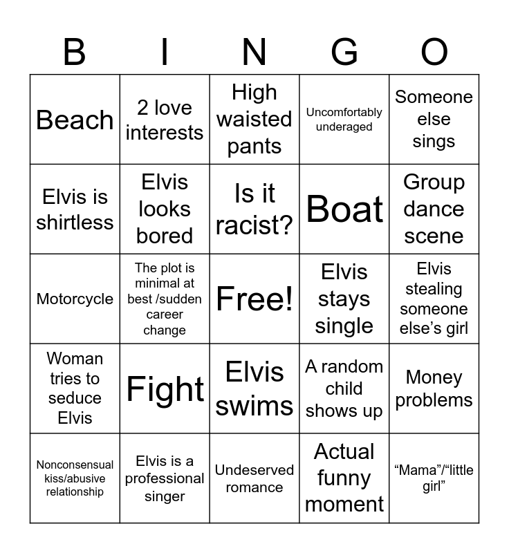 This bingo card has a free space and 24 words: Fight, Elvis is a professional singer, Is it racist?, Nonconsensual kiss/abusive relationship, Someone else sings, Beach, Elvis is shirtless, 2 love interests, Elvis stays single, Elvis swims, Boat, Motorcycle, A random child shows up, Money problems, Elvis looks bored, Actual funny moment, Elvis stealing someone else’s girl, High waisted pants, Group dance scene, The plot is minimal at best /sudden career change, “Mama”/“little girl”, Woman tries to seduce Elvis, Uncomfortably underaged and Undeserved romance.