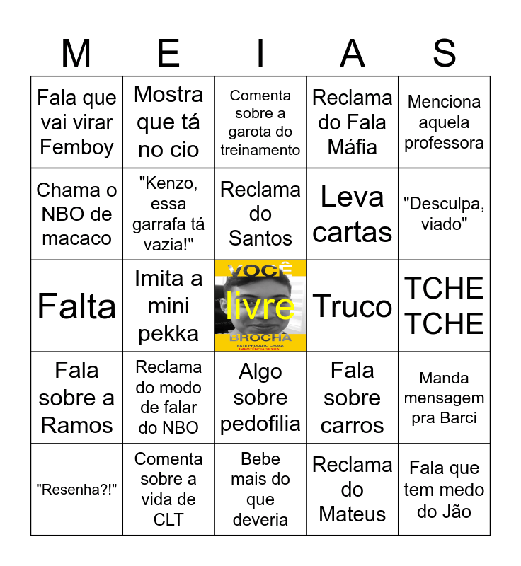 This bingo card has a free space and 24 words: Reclama do modo de falar do NBO, Comenta sobre a vida de CLT, Reclama do Santos, "Resenha?!", Menciona aquela professora, Fala que vai virar Femboy, Chama o NBO de macaco, Mostra que tá no cio, Truco, Algo sobre pedofilia, Leva cartas, Falta, Fala sobre carros, Manda mensagem pra Barci, "Kenzo, essa garrafa tá vazia!", Reclama do Mateus, TCHE TCHE, Comenta sobre a garota do treinamento, "Desculpa, viado", Imita a mini pekka, Fala que tem medo do Jão, Fala sobre a Ramos, Reclama do Fala Máfia and Bebe mais do que deveria.