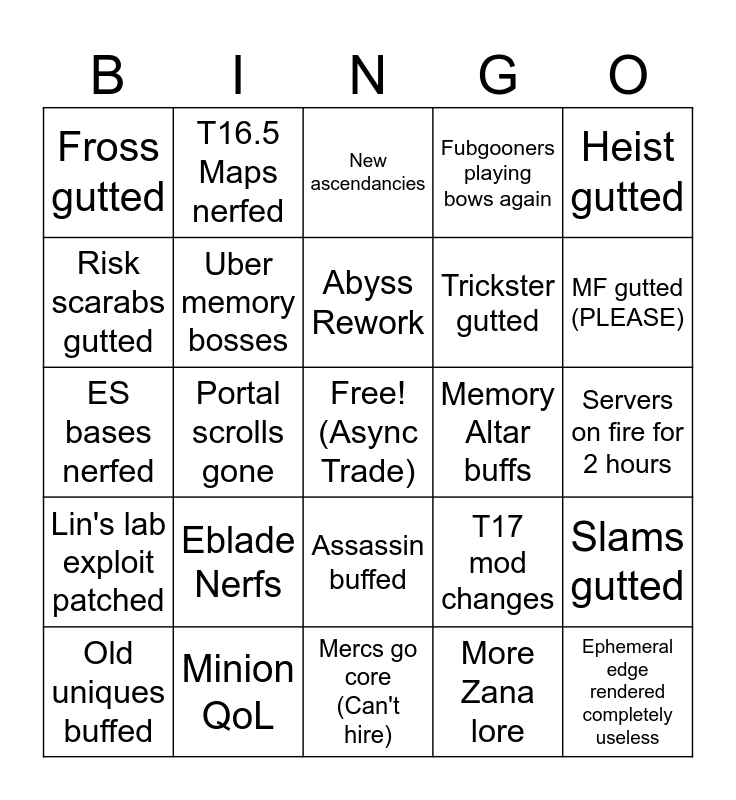 This bingo card has a free space and 24 words: Eblade Nerfs, Minion QoL, Abyss Rework, Old uniques buffed, Heist gutted, Fross gutted, Risk scarabs gutted, T16.5 Maps nerfed, Memory Altar buffs, Assassin buffed, Trickster gutted, ES bases nerfed, T17 mod changes, Slams gutted, Uber memory bosses, More Zana lore, Servers on fire for 2 hours, New ascendancies, MF gutted (PLEASE), Portal scrolls gone, Ephemeral edge rendered completely useless, Lin's lab exploit patched, Fubgooners playing bows again and Mercs go core (Can't hire).