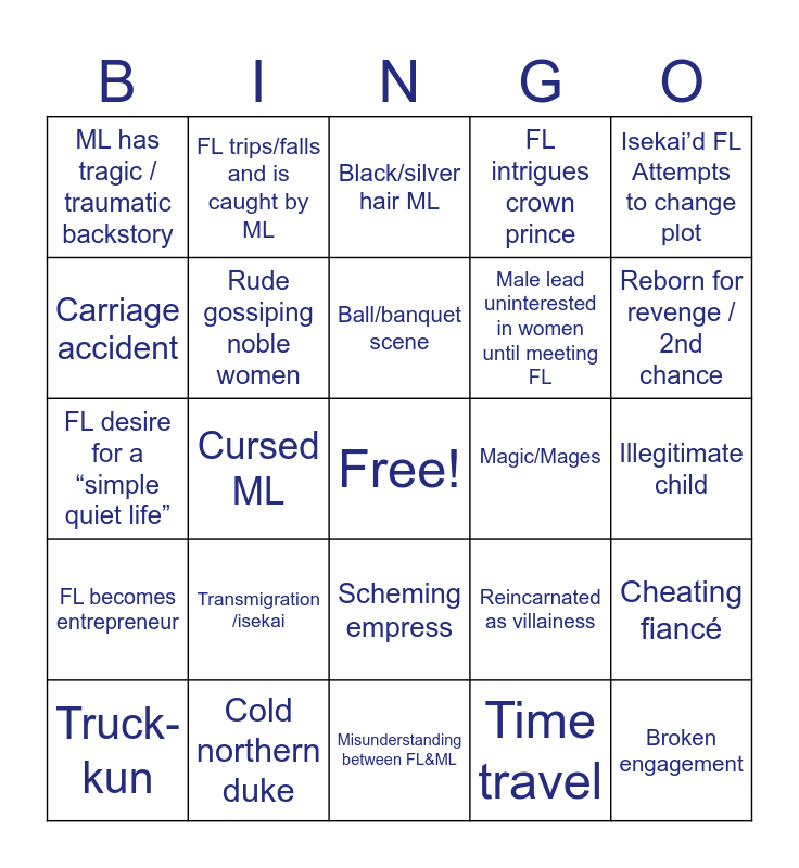 This bingo card has a free space and 24 words: Transmigration /isekai, Cold northern duke, Ball/banquet scene, Truck-kun, Isekai’d FL Attempts to change plot, ML has tragic / traumatic backstory, Carriage accident, FL trips/falls and is caught by ML, Magic/Mages, Scheming empress, Male lead uninterested in women until meeting FL, FL desire for a “simple quiet life”, Reincarnated as villainess, Cheating fiancé, Rude gossiping noble women, Time travel, Illegitimate child, Black/silver hair ML, Reborn for revenge / 2nd chance, Cursed ML, Broken engagement, FL becomes entrepreneur, FL intrigues crown prince and Misunderstanding between FL&ML.