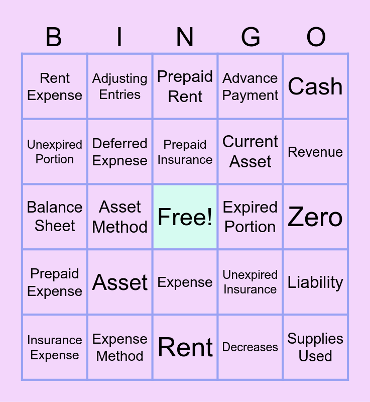 This bingo card has a free space and 24 words: Asset, Expense Method, Prepaid Insurance, Insurance Expense, Cash, Rent Expense, Unexpired Portion, Adjusting Entries, Expired Portion, Expense, Current Asset, Balance Sheet, Unexpired Insurance, Liability, Deferred Expnese, Decreases, Zero, Prepaid Rent, Revenue, Asset Method, Supplies Used, Prepaid Expense, Advance Payment and Rent.