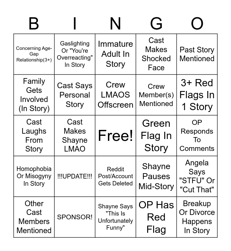 This bingo card has a free space and 24 words: !!!UPDATE!!!, SPONSOR!, Crew LMAOS Offscreen, Other Cast Members Mentioned, Past Story Mentioned, Concerning Age-Gap Relationship(3+), Family Gets Involved (In Story), Gaslighting Or "You're Overreacting" In Story, Green Flag In Story, Reddit Post/Account Gets Deleted, Crew Member(s) Mentioned, Cast Laughs From Story, Shayne Pauses Mid-Story, Angela Says "STFU" Or "Cut That", Cast Says Personal Story, OP Has Red Flag, OP Responds To Comments, Immature Adult In Story, 3+ Red Flags In 1 Story, Cast Makes Shayne LMAO, Breakup Or Divorce Happens In Story, Homophobia Or Misogyny In Story, Cast Makes Shocked Face and Shayne Says "This Is Unfortunately Funny".