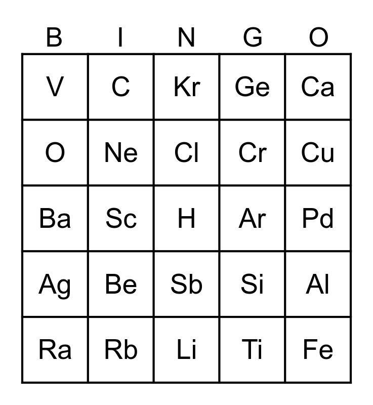 This bingo card has 52 words: Free!, H, He, Li, Be, B, C, N, O, F, Ne, Mg, Al, Si, P, S, Cl, Ar, K, Ca, Sc, Ti, V, Cr, Mn, Fe, Co, Ni, Cu, Zn, Ga, Ge, As, Se, Br, Kr, Rb, Sr, Y, Zr, Nb, Pd, Ag, Sn, Sb, I, Xe, Ba, W, Pb, Ra and U.