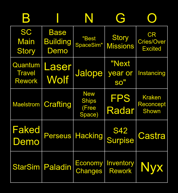 This bingo card has a free space and 47 words: MT with planet tech v5, Nyx, "I held the line", Economy Changes, Perseus, Elliot Cringe, Base Building Demo, Dynamic Meshing, Quantum Travel Rework, Disco Monologue, Laser Wolf, Story Missions, Castra, S42 Surpise, VOIP Update, New Social Mobi App, Jalope, FPS Radar, Engineering Demo, CR Cries/Over Excited, Crafting, Inventory Rework, SC Main Story, "Next year or so", New Fauna, Instancing, StarSim, New "Star"Tech, Hacking, Faked Demo, New Flight Model, "Bespoke", MISC Raptor, Boss Fight, StarWear, Paladin, Kraken Reconcept Shown, Terra, T1 Item Recovery, New Log Out System, Mission Givers, "Best SpaceSim", Maelstrom, Bounty Hunting 2.0, Map Markers, Player Trading and Map Markers.