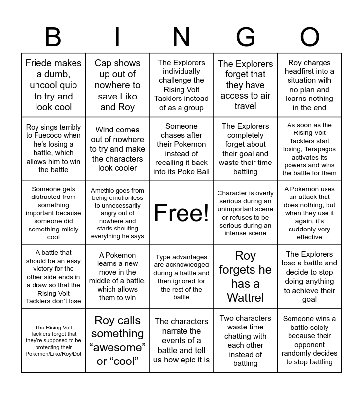This bingo card has a free space and 24 words: A Pokemon learns a new move in the middle of a battle, which allows them to win, Roy calls something “awesome” or “cool”, Someone chases after their Pokemon instead of recalling it back into its Poke Ball, The Rising Volt Tacklers forget that they’re supposed to be protecting their Pokemon/Liko/Roy/Dot, Roy charges headfirst into a situation with no plan and learns nothing in the end, Friede makes a dumb, uncool quip to try and look cool, Roy sings terribly to Fuecoco when he’s losing a battle, which allows him to win the battle, Cap shows up out of nowhere to save Liko and Roy, Character is overly serious during an unimportant scene or refuses to be serious during an intense scene, Type advantages are acknowledged during a battle and then ignored for the rest of the battle, The Explorers completely forget about their goal and waste their time battling, Someone gets distracted from something important because someone did something mildly cool, Roy forgets he has a Wattrel, The Explorers lose a battle and decide to stop doing anything to achieve their goal, Wind comes out of nowhere to try and make the characters look cooler, Two characters waste time chatting with each other instead of battling, A Pokemon uses an attack that does nothing, but when they use it again, it’s suddenly very effective, The Explorers individually challenge the Rising Volt Tacklers instead of as a group, As soon as the Rising Volt Tacklers start losing, Terapagos activates its powers and wins the battle for them, Amethio goes from being emotionless to unnecessarily angry out of nowhere and starts shouting everything he says, Someone wins a battle solely because their opponent randomly decides to stop battling, A battle that should be an easy victory for the other side ends in a draw so that the Rising Volt Tacklers don’t lose, The Explorers forget that they have access to air travel and The characters narrate the events of a battle and tell us how epic it is.
