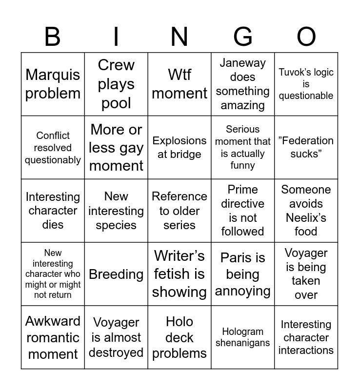 This bingo card has 25 words: Breeding, Holo deck problems, Explosions at bridge, Awkward romantic moment, Tuvok’s logic is questionable, Marquis problem, Conflict resolved questionably, Crew plays pool, Prime directive is not followed, Writer’s fetish is showing, Serious moment that is actually funny, Interesting character dies, Paris is being annoying, Voyager is being taken over, More or less gay moment, Interesting character interactions, Someone avoids Neelix’s food, Wtf moment, ”Federation sucks”, New interesting species, Reference to older series, Voyager is almost destroyed, New interesting character who might or might not return, Janeway does something amazing and Hologram shenanigans.
