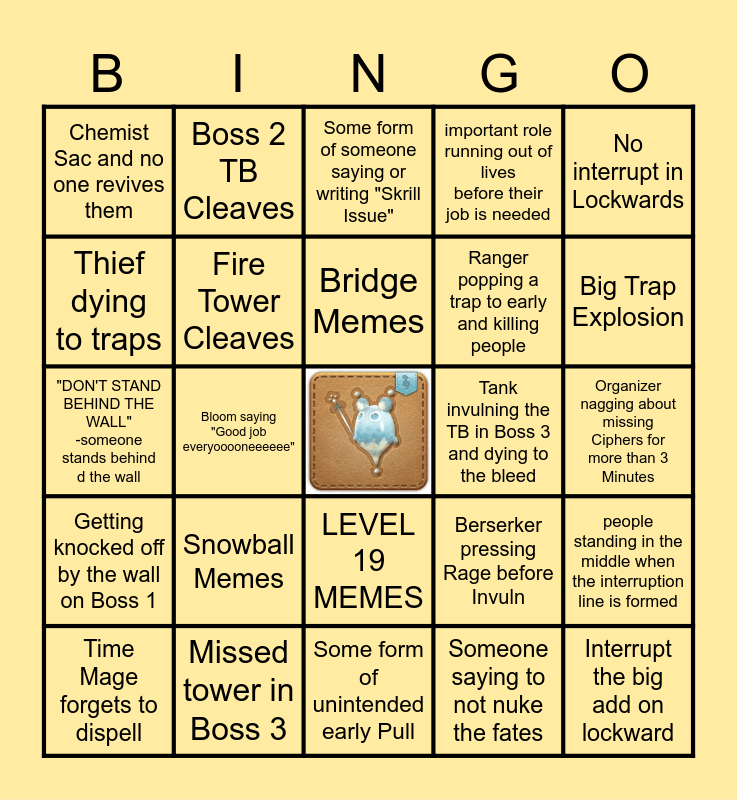 This bingo card has a free space and 24 words: Snowball Memes, Missed tower in Boss 3, Bridge Memes, Time Mage forgets to dispell, No interrupt in Lockwards, Chemist Sac and no one revives them, Thief dying to traps, Boss 2 TB Cleaves, Tank invulning the TB in Boss 3 and dying to the bleed, LEVEL 19 MEMES, Ranger popping a trap to early and killing people, "DON'T STAND BEHIND THE WALL" -someone stands behind d the wall, Berserker pressing Rage before Invuln, people standing in the middle when the interruption line is formed, Fire Tower Cleaves, Someone saying to not nuke the fates, Organizer nagging about missing Ciphers for more than 3 Minutes, Some form of someone saying or writing "Skrill Issue", Big Trap Explosion, Bloom saying "Good job everyooooneeeeee", Interrupt the big add on lockward, Getting knocked off by the wall on Boss 1, important role running out of lives before their job is needed and Some form of unintended early Pull.