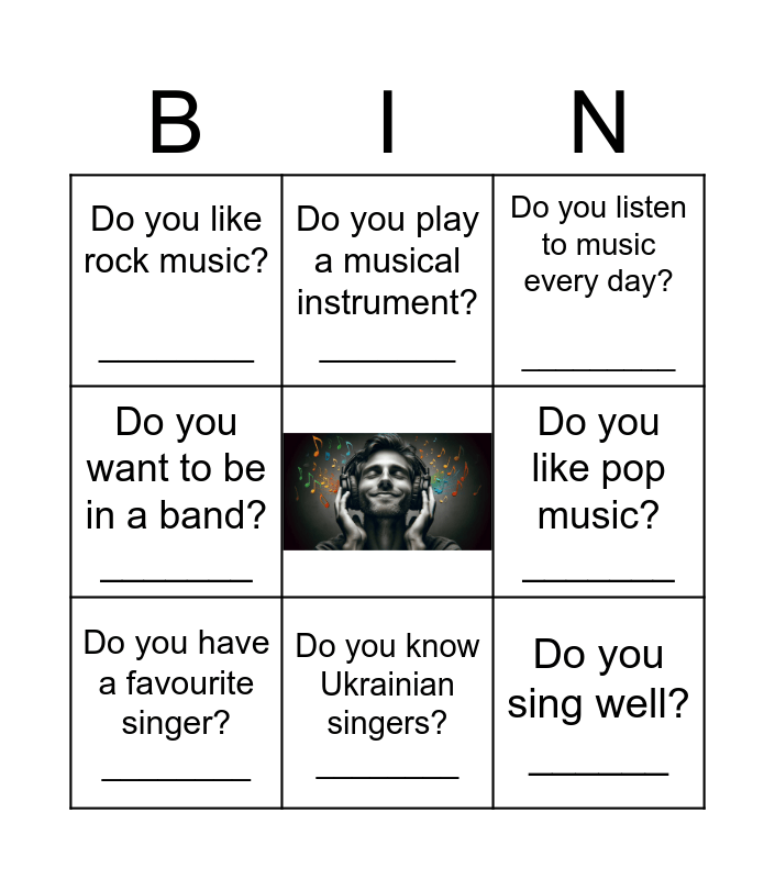 This bingo card has a free space and 8 words: Do you like pop music? _______, Do you listen to music every day? _________, Do you play a musical instrument? _______, Do you have a favourite singer? ________, Do you like rock music? ________, Do you sing well? ______, Do you want to be in a band? _______ and Do you know Ukrainian singers? ________.