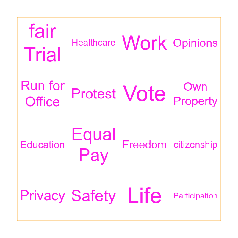 This bingo card has 16 words: Safety, citizenship, Work, fair Trial, Education, Healthcare, Freedom, Life, Run for Office, Protest, Privacy, Opinions, Equal Pay, Own Property, Vote and Participation.