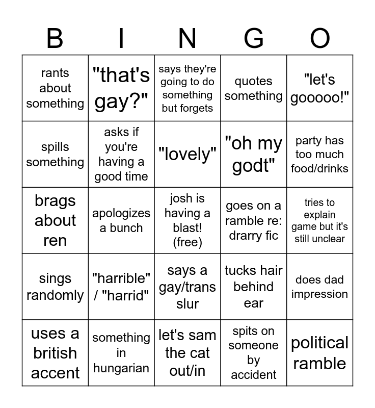 This bingo card has a free space and 24 words: "harrible" / "harrid", something in hungarian, "lovely", uses a british accent, "let's gooooo!", rants about something, spills something, "that's gay?", goes on a ramble re: drarry fic, says a gay/trans slur, "oh my godt", brags about ren, tucks hair behind ear, does dad impression, asks if you're having a good time, spits on someone by accident, tries to explain game but it's still unclear, says they're going to do something but forgets, party has too much food/drinks, apologizes a bunch, political ramble, sings randomly, quotes something and let's sam the cat out/in.