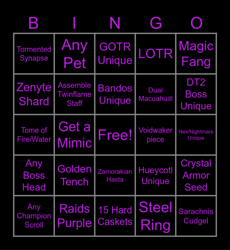 This bingo card has a free space and 24 words: Golden Tench, Raids Purple, Bandos Unique, Any Champion Scroll, Magic Fang, Tormented Synapse, Zenyte Shard, Any Pet, Voidwaker piece, Zamorakian Hasta, Dual Macuahuitl, Tome of Fire/Water, Hueycotl Unique, Crystal Armor Seed, Assemble Twinflame Staff, Steel Ring, Nex/Nightmare Unique, GOTR Unique, DT2 Boss Unique, Get a Mimic, Sarachnis Cudgel, Any Boss Head, LOTR and 15 Hard Caskets.