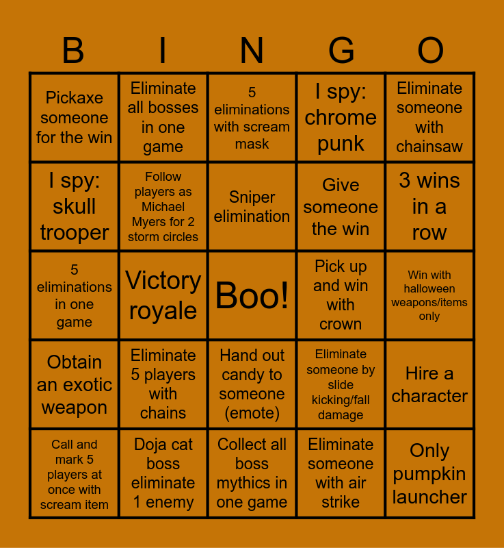 This bingo card has a free space and 24 words: Eliminate 5 players with chains, Doja cat boss eliminate 1 enemy, Sniper elimination, Call and mark 5 players at once with scream item, Eliminate someone with chainsaw, Pickaxe someone for the win, I spy: skull trooper, Eliminate all bosses in one game, Pick up and win with crown, Hand out candy to someone (emote), Give someone the win, 5 eliminations in one game, Eliminate someone by slide kicking/fall damage, Hire a character, Follow players as Michael Myers for 2 storm circles, Eliminate someone with air strike, Win with halloween weapons/items only, 5 eliminations with scream mask, 3 wins in a row, Victory royale, Only pumpkin launcher, Obtain an exotic weapon, I spy: chrome punk and Collect all boss mythics in one game.
