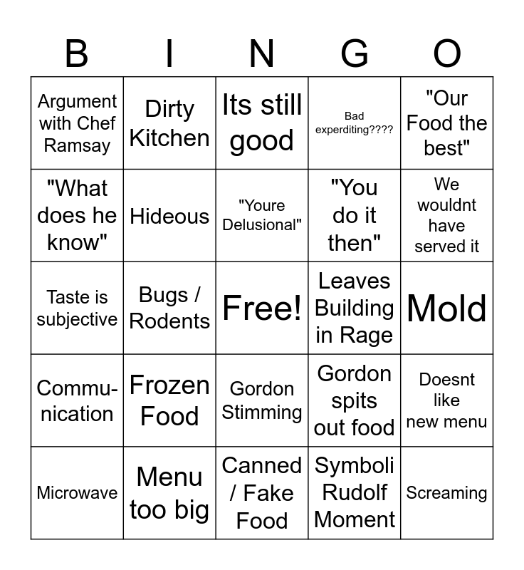 This bingo card has a free space and 24 words: Frozen Food, Menu too big, "Youre Delusional", Microwave, "Our Food the best", Argument with Chef Ramsay, "What does he know", Dirty Kitchen, Leaves Building in Rage, Gordon Stimming, "You do it then", Taste is subjective, Gordon spits out food, Doesnt like new menu, Hideous, Symboli Rudolf Moment, Mold, Its still good, We wouldnt have served it, Bugs / Rodents, Screaming, Commu-nication, Bad experditing???? and Canned / Fake Food.