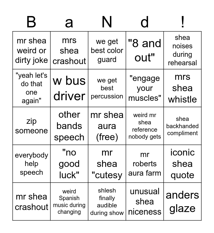 This bingo card has a free space and 33 words: lock in speech, "BA not DA", other bands speech, prop malfunction, everybody help speech, w bus driver, shea noises during rehearsal, mr shea crashout, mrs shea crashout, we win, we get best percussion, we get best color guard, great show guys, in through the nose out through the mouth, weird mr shea reference nobody gets, mrs shea whistle, weird Spanish music during changing, zip someone, "no good luck", mr roberts aura farm, mr shea "cutesy, kona ice present, mr shea weird or dirty joke, shea backhanded compliment, shlesh finally audible during show, anders glaze, "8 and out", "engage your muscles", "yeah let's do that one again", iconic shea quote, korey aura farm (extra free space 😘), unusual shea niceness and any band wins by a fraction of a point.