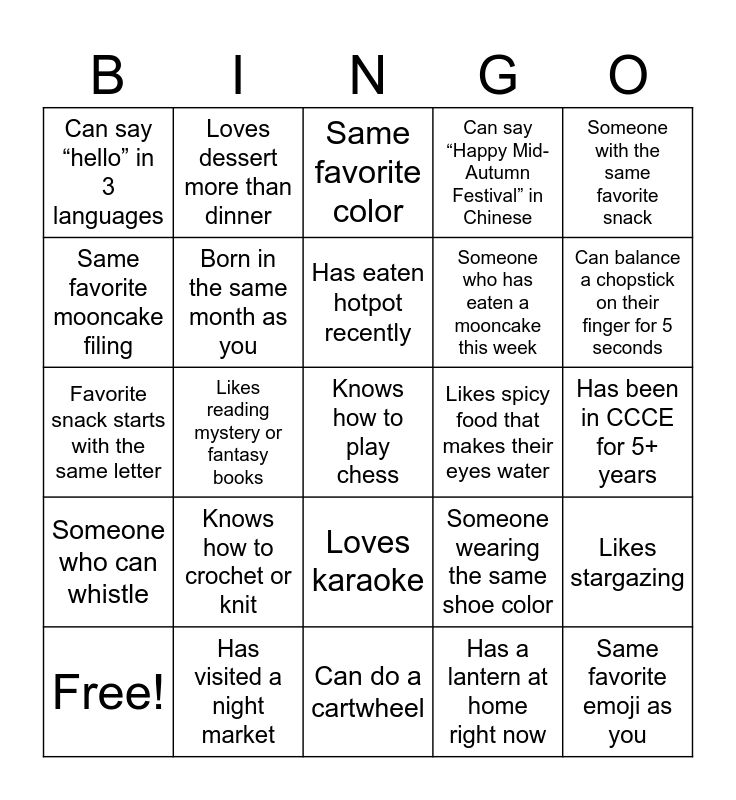 This bingo card has 29 words: Free!, Loves bubble tea, Likes reading mystery or fantasy books, Same favorite emoji as you, Can say “hello” in 3 languages, Same favorite color, Born in the same month as you, Knows how to crochet or knit, Likes spicy food that makes their eyes water, Has visited a night market, Has been in CCCE for 5+ years, Knows how to play chess, Can do a cartwheel, Has a lantern at home right now, Can balance a chopstick on their finger for 5 seconds, Has tried cooking or baking something new in the last month, Loves karaoke, Someone who can whistle, Someone with the same favorite snack, Favorite snack starts with the same letter, Someone wearing the same shoe color, Someone has same favorite hobby, Someone who has eaten a mooncake this week, Same favorite mooncake filing, Can say “Happy Mid-Autumn Festival” in Chinese, Loves dessert more than dinner, Likes stargazing, Has eaten hotpot recently and Likes savory snacks more than sweet ones.