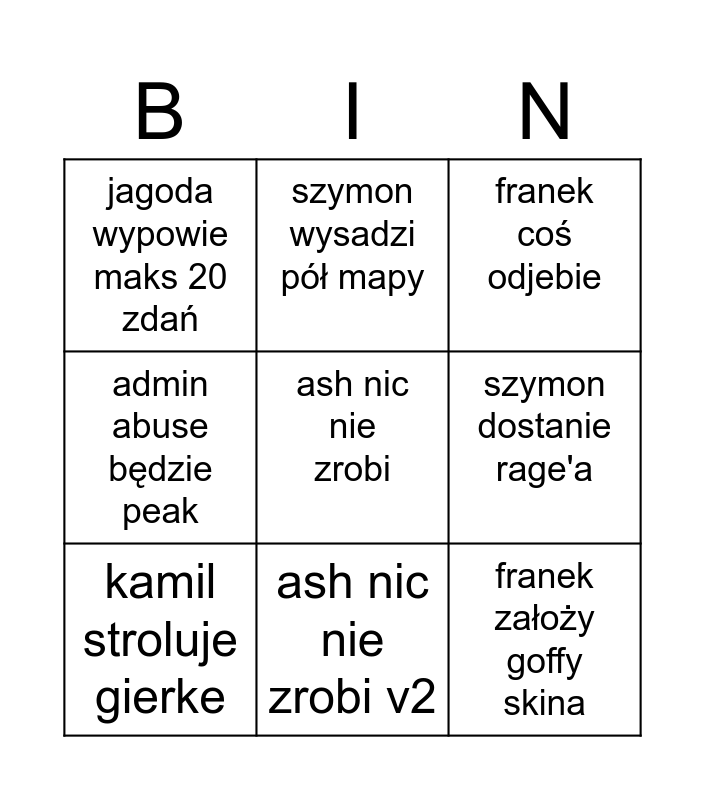 This bingo card has a free space and 8 words: szymon dostanie rage'a, franek coś odjebie, szymon wysadzi pół mapy, kamil stroluje gierke, jagoda wypowie maks 20 zdań, franek założy goffy skina, admin abuse będzie peak and ash nic nie zrobi v2.