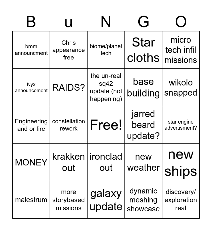 This bingo card has a free space and 24 words: krakken out, more storybased missions, the un-real sq42 update (not happening), malestrum, micro tech infil missions, bmm announcment, Nyx announcement, Chris appearance free, jarred beard update?, ironclad out, base building, Engineering and or fire, new weather, new ships, RAIDS?, dynamic meshing showcase, star engine advertisment?, biome/planet tech, wikolo snapped, constellation rework, discovery/ exploration real, MONEY, Star cloths and galaxy update.