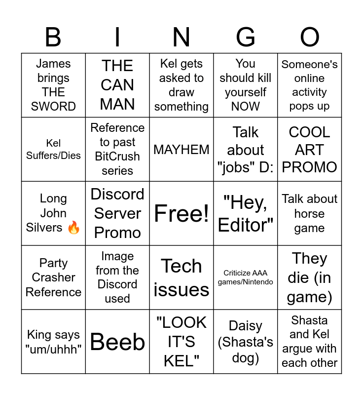 This bingo card has a free space and 26 words: Tech issues, Daisy (Shasta's dog), MAYHEM, Beeb, Someone's online activity pops up, James brings THE SWORD, Kel Suffers/Dies, THE CAN MAN, Talk about horse game, Criticize AAA games/Nintendo, Talk about "jobs" D:, Long John Silvers š„, They die (in game), King says "um/uhhh", Discord Server Promo, Richie talks about Sonic, You should kill yourself NOW, Party Crasher Reference, Kel gets asked to draw something, Shasta and Kel argue with each other, COOL ART PROMO, "LOOK IT'S KEL", "Hey, Editor", Image from the Discord used, Reference to past BitCrush series and Pilk.