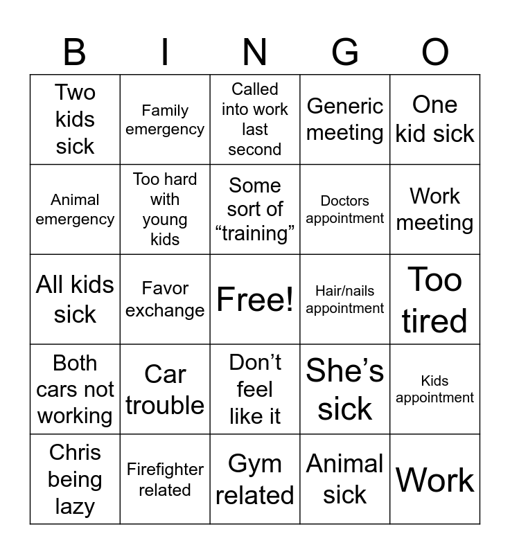 This bingo card has a free space and 24 words: Car trouble, Firefighter related, Some sort of “training”, Chris being lazy, One kid sick, Two kids sick, Animal emergency, Family emergency, Hair/nails appointment, Don’t feel like it, Doctors appointment, All kids sick, She’s sick, Kids appointment, Too hard with young kids, Animal sick, Too tired, Called into work last second, Work meeting, Favor exchange, Work, Both cars not working, Generic meeting and Gym related.