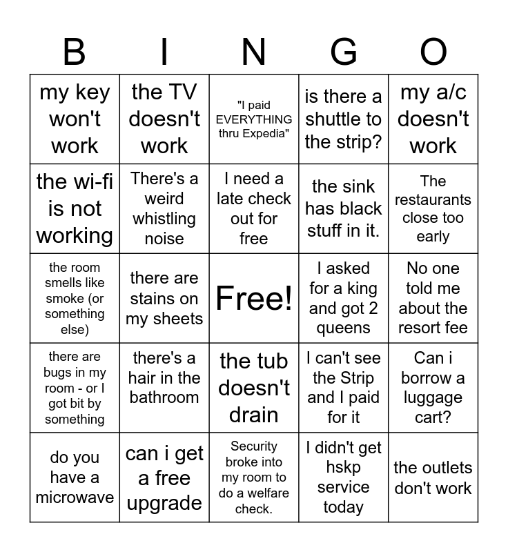 This bingo card has a free space and 24 words: there's a hair in the bathroom, can i get a free upgrade, I need a late check out for free, do you have a microwave, my a/c doesn't work, my key won't work, the wi-fi is not working, the TV doesn't work, I asked for a king and got 2 queens, the tub doesn't drain, the sink has black stuff in it., the room smells like smoke (or something else), I can't see the Strip and I paid for it, Can i borrow a luggage cart?, There's a weird whistling noise, I didn't get hskp service today, No one told me about the resort fee, "I paid EVERYTHING thru Expedia", The restaurants close too early, there are stains on my sheets, the outlets don't work, there are bugs in my room - or I got bit by something, is there a shuttle to the strip? and Security broke into my room to do a welfare check..