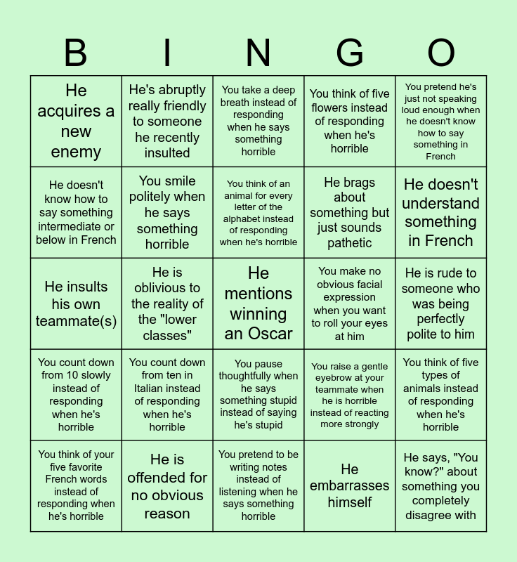 This bingo card has 30 words: He is offended for no obvious reason, He asks why he should have to learn something, He is oblivious to the reality of the "lower classes", He dies something that would get him fired in the real world, He acquires a new enemy, You take a deep breath instead of responding when he says something horrible, You smile politely when he says something horrible, You pause thoughtfully when he says something stupid instead of saying he's stupid, You make no obvious facial expression when you want to roll your eyes at him, You pretend to be writing notes instead of listening when he says something horrible, He is rude to someone who was being perfectly polite to him, He mentions winning an Oscar, He embarrasses himself, He says, "You know?" about something you completely disagree with, He doesn't understand something in French, You pretend not to notice when he doesn't understand something in French, You raise a gentle eyebrow at your teammate when he is horrible instead of reacting more strongly, You count down from 10 slowly instead of responding when he's horrible, You count down from ten in Italian instead of responding when he's horrible, You pretend he's just not speaking loud enough when he doesn't know how to say something in French, He insults his own teammate(s), He acts like he doesn't have anything to learn, He's abruptly really friendly to someone he recently insulted, He brags about something but just sounds pathetic, He doesn't know how to say something intermediate or below in French, You think of five flowers instead of responding when he's horrible, You think of five types of animals instead of responding when he's horrible, You think of your five favorite French words instead of responding when he's horrible, You think of an animal for every letter of the alphabet instead of responding when he's horrible and You learn a poem and recite it to yourself instead of responding when he's horrible.