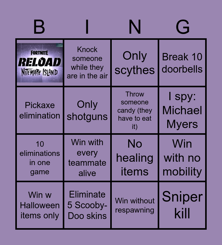 This bingo card has 1 images and 15 words: Win w Halloween items only, Eliminate 5 Scooby-Doo skins, Only scythes, Break 10 doorbells, Pickaxe elimination, Knock someone while they are in the air, No healing items, Win with no mobility, Only shotguns, Win without respawning, I spy: Michael Myers, 10 eliminations in one game, Win with every teammate alive, Throw someone candy (they have to eat it) and Sniper kill.