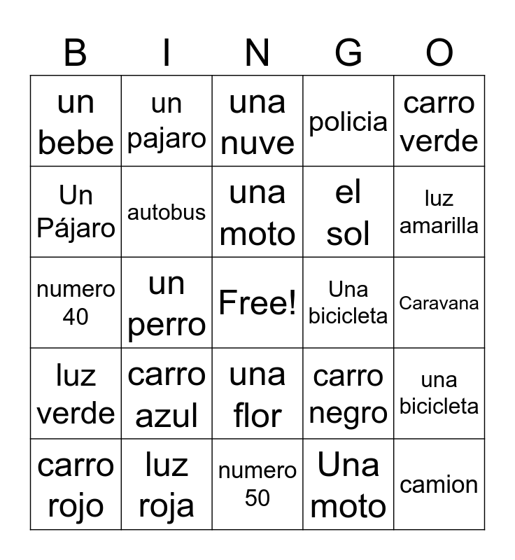This bingo card has a free space and 29 words: carro rojo, numero 25, un perro, un arbol, un bebe, una nuve, autobus, carro azul, Una bicicleta, luz roja, Caravana, camion, numero 50, Una moto, luz amarilla, STOP, una flor, luz verde, carro verde, numero 40, carro negro, gasolinera, el sol, Un Pájaro, policia, un pajaro, una bicicleta, una moto and autopista.