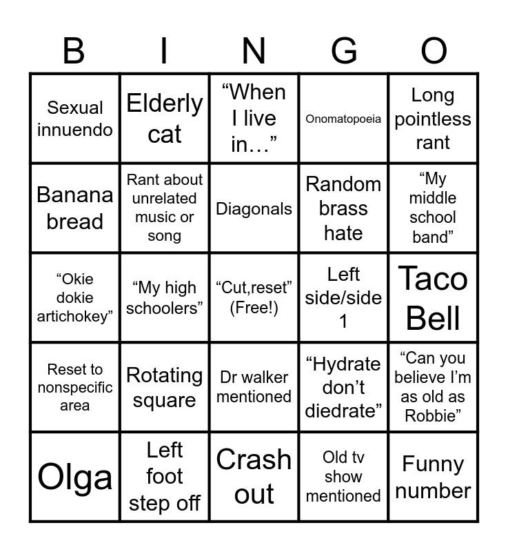 This bingo card has a free space and 24 words: Rotating square, Left foot step off, Diagonals, Olga, Long pointless rant, Sexual innuendo, Banana bread, Elderly cat, Left side/side 1, Dr walker mentioned, Random brass hate, “Okie dokie artichokey”, “Hydrate don’t diedrate”, “Can you believe I’m as old as Robbie”, Rant about unrelated music or song, Old tv show mentioned, Taco Bell, “When I live in…”, “My middle school band”, “My high schoolers”, Funny number, Reset to nonspecific area, Onomatopoeia and Crash out.